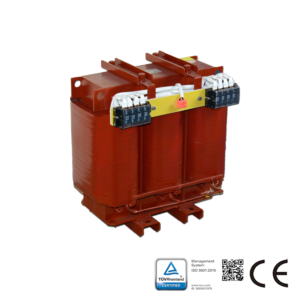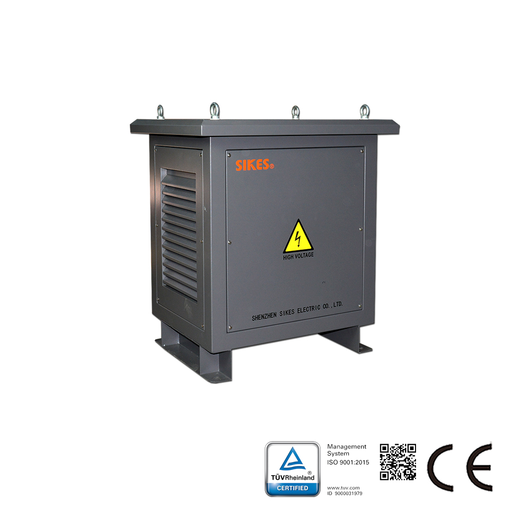 Materiales: Núcleo de chapa de acero al silicio de alta calidad, que garantiza bajas pérdidas en vacío y reducido nivel de ruido. Para baja capacidad se emplea alambre esmaltado rectangular, y para alta capacidad se utiliza lámina de aluminio, fabricado mediante impregnación a presión al vacío, lo que confiere al transformador alta resistencia mecánica y capacidad de protección contra la humedad.